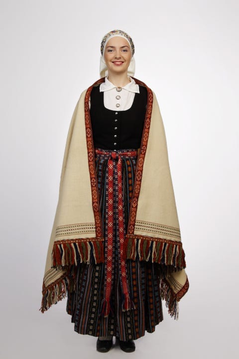 These differences, among others, are highlighted and put on display during the quinquennial Lativan Song and Dance Festival, the biggest event in Latvian culture. The first Lativan Song and Dance Festival took place in 1873, during the First Wave of National Awakening the country experience between 1850 and 1880. Today, the festival commemorates the founding of Latvia as a nation and Latvian culture as a unique identity. Over 500,000 revelers and 40,000 performers fill the streets of Riga, the country’s capital, taking place in exhibitions, events, competitions, parades, and as you would expect from its name, songs and dances. Dresses play a role as well, with most—if not everyone—wearing dresses passed down from previous generations or exemplifying their home region. There’s even a costume showcase event, where modelers showcase Latvian fashion designers’ takes and adaptations on the traditional garb.